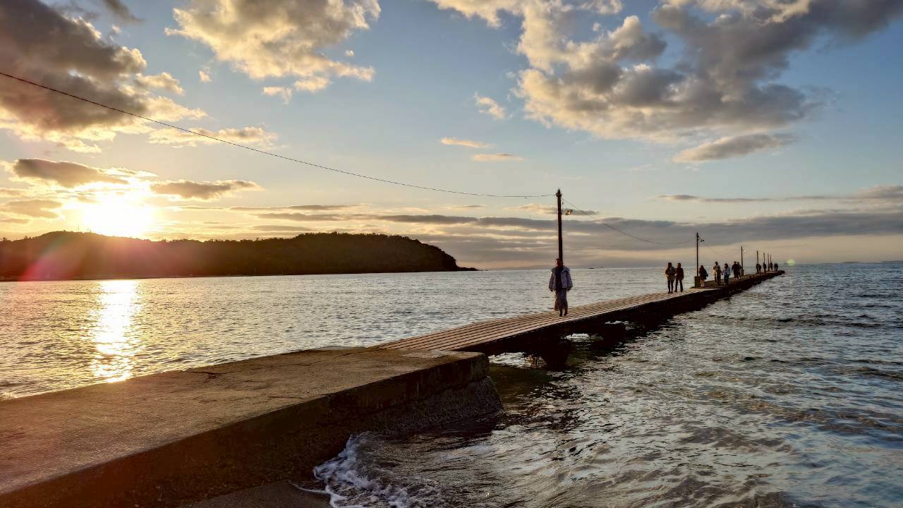 木製の海桟橋でノスタルジックな風景で、夕日が沈む時間帯には多くの人が集まる