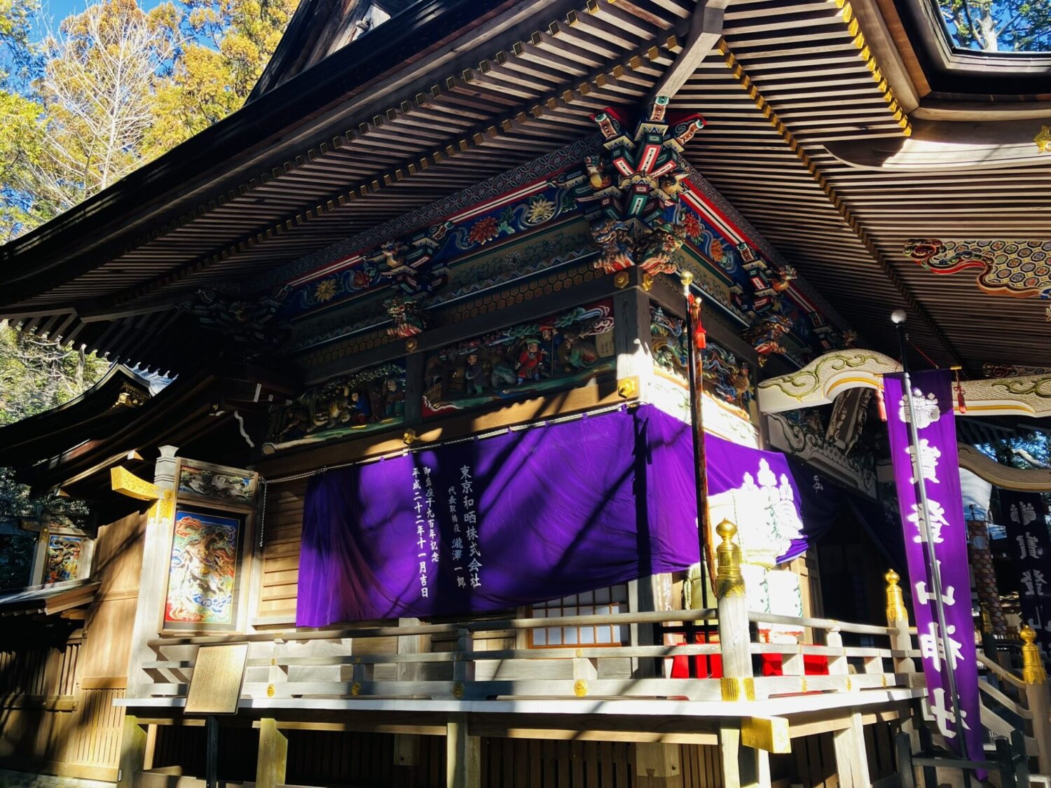 欄間を見ると、「二十四孝」という中国の物語や、龍、鶴などのさまざまな動物たちが彫刻されています。