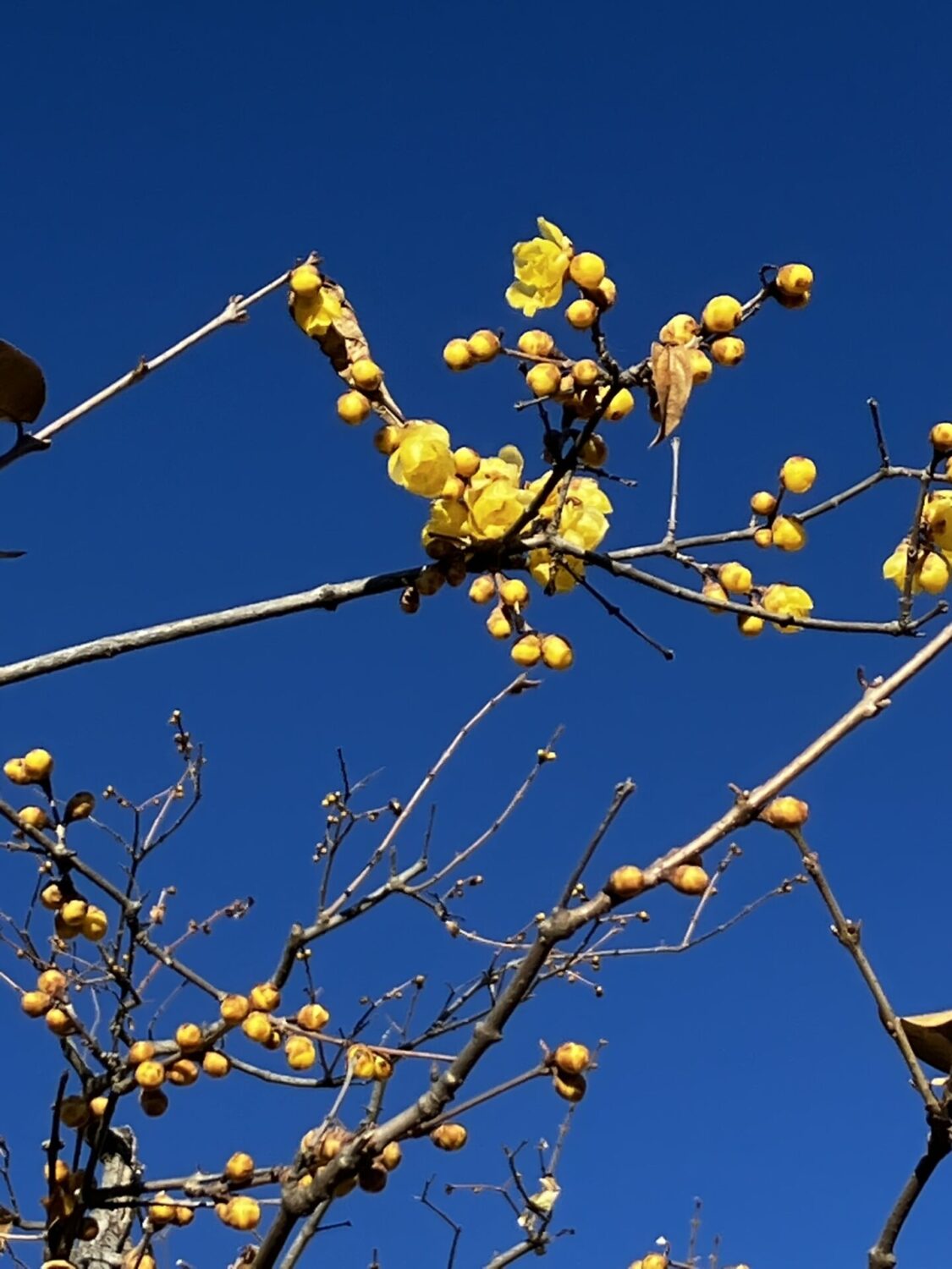 青い空と黄色いロウバイの対比がポップでかわいらしいです。
