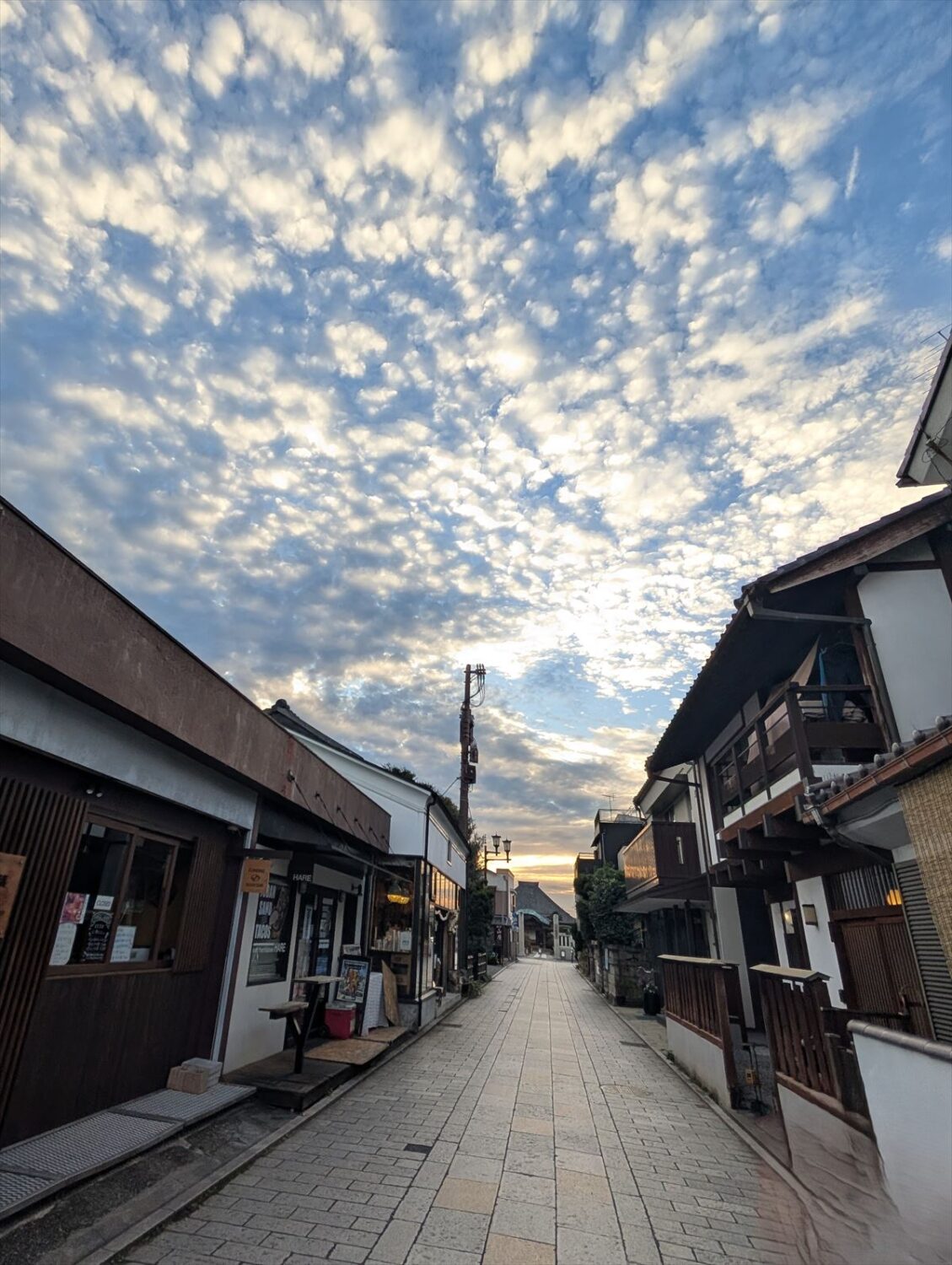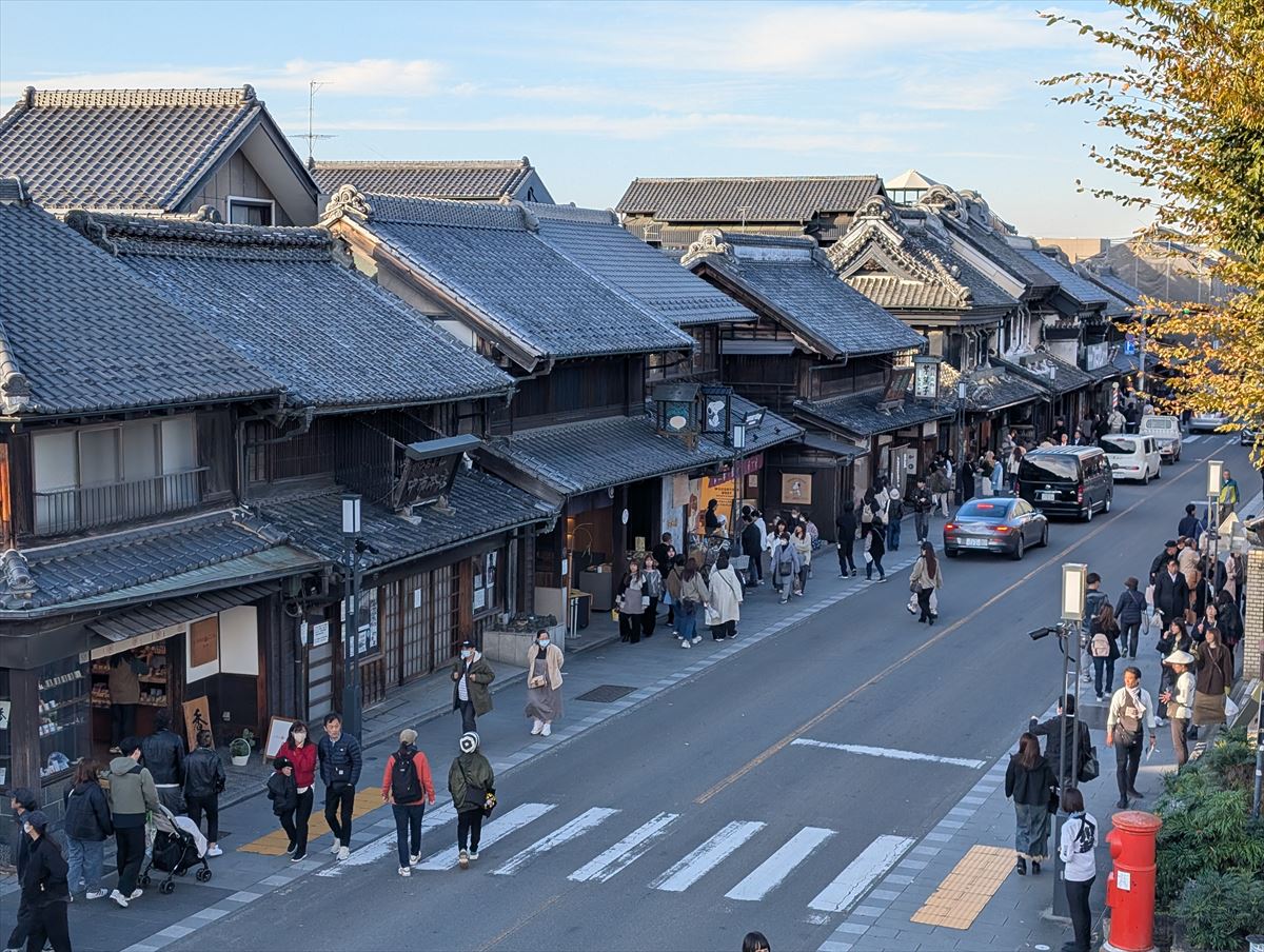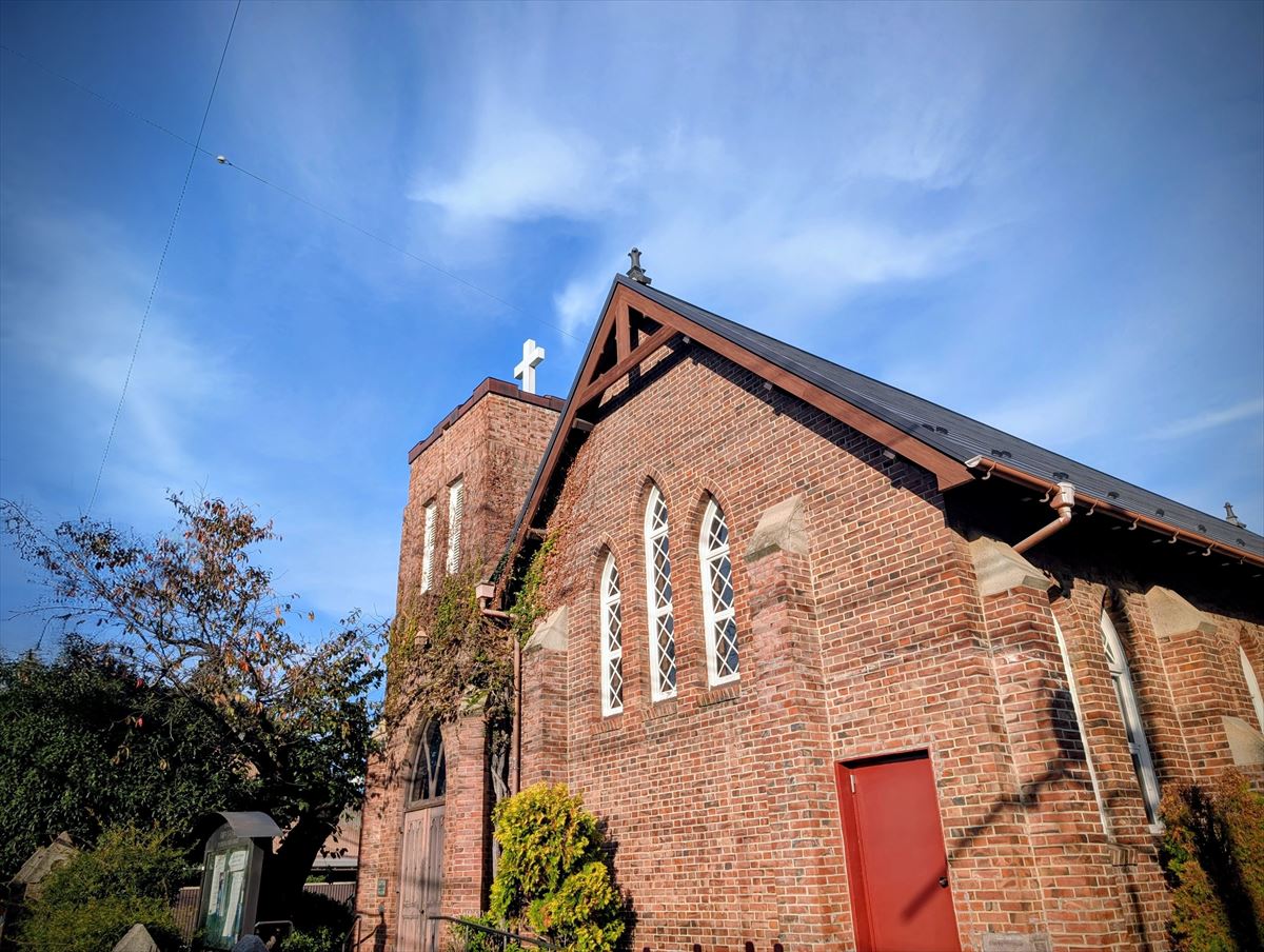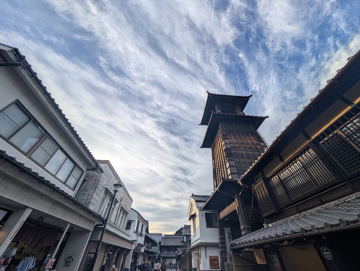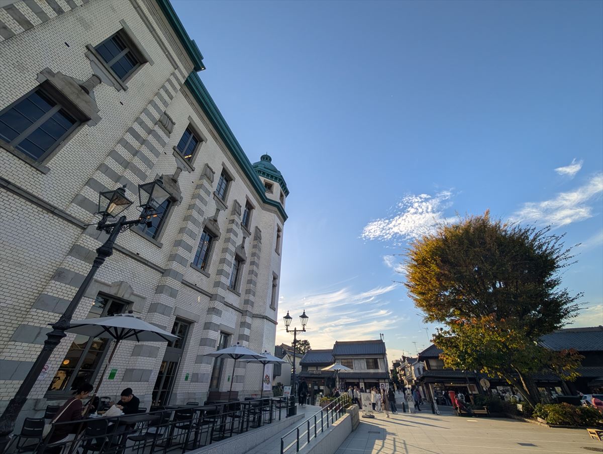 川越キリスト教会の建物を眺めながら、蔵造りの街並みである