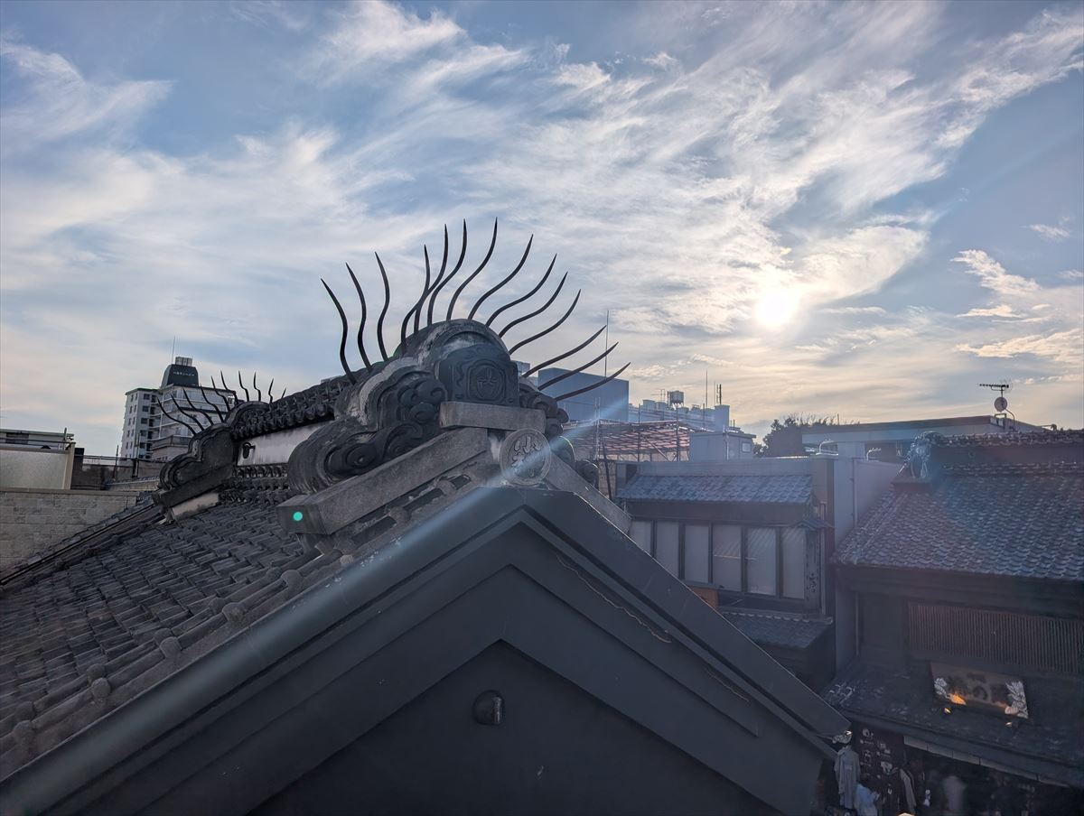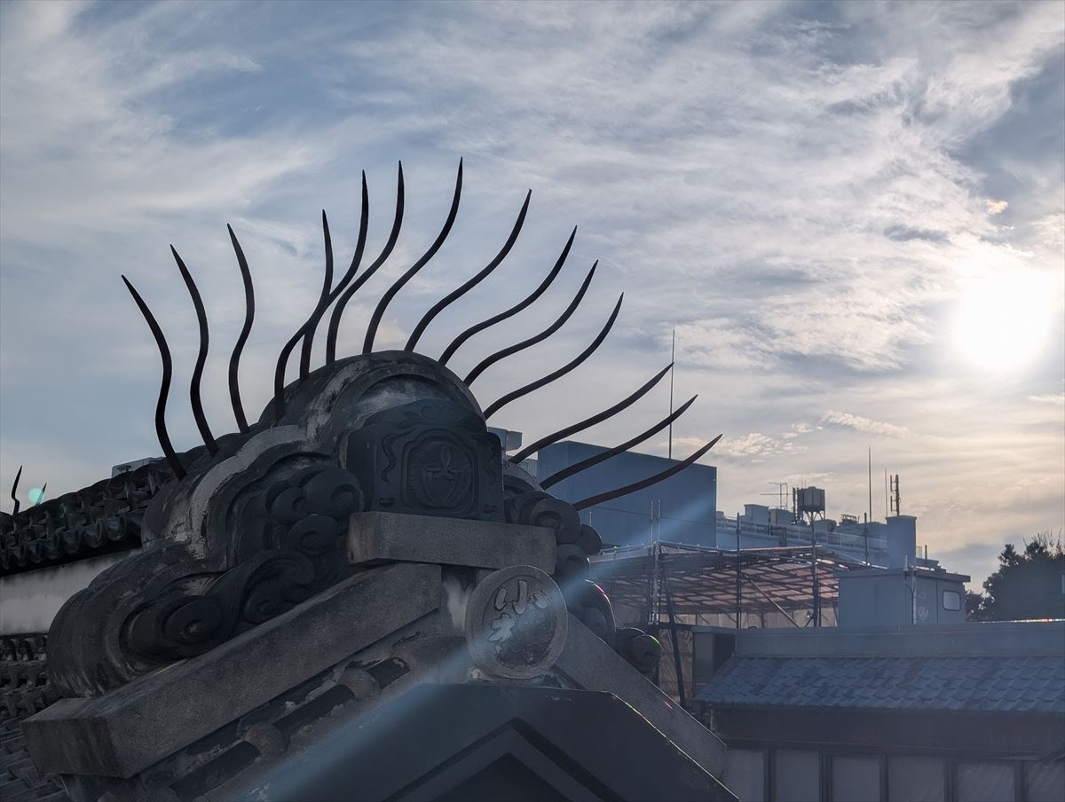 この鬼瓦は珍しいもので、奇妙な形をした装飾金具が14本、空に向かって突き出され