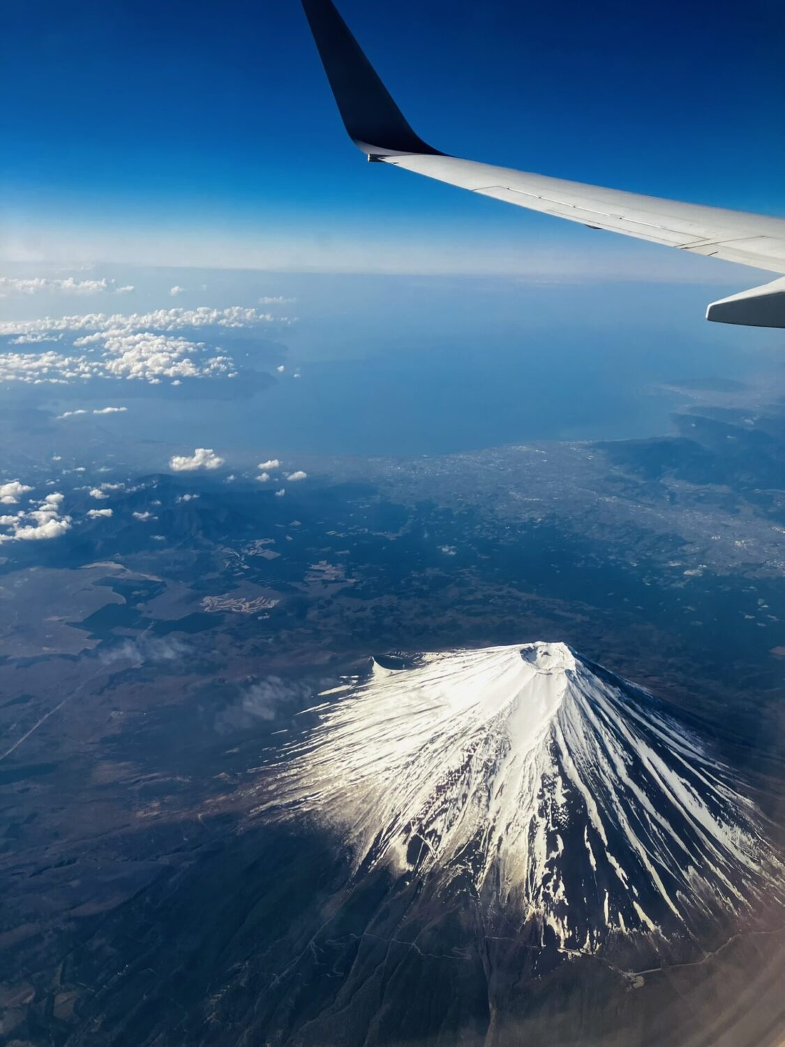 (写真は、飛行機から撮った富士山です。初めて上から見ましたが、まさに圧巻ですね!)