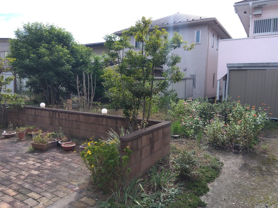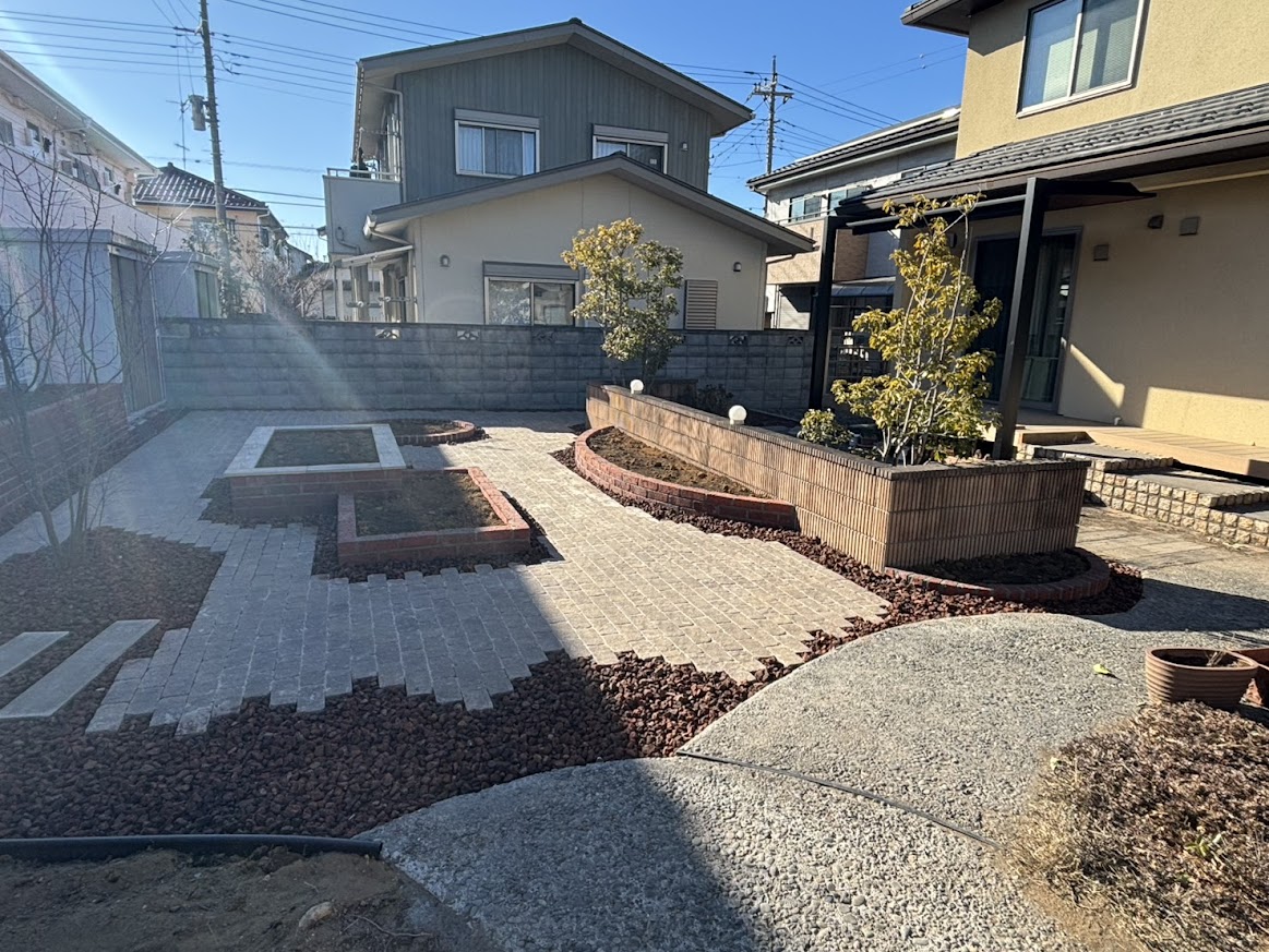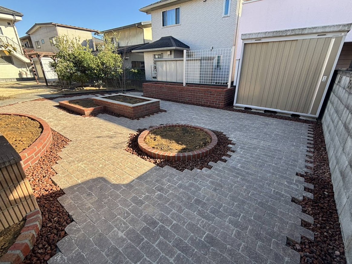 手つかずで管理が大変だったお庭をリフォーム中ですが、レンガやインターロッキングを多く活用しながら洋風なお庭へ。